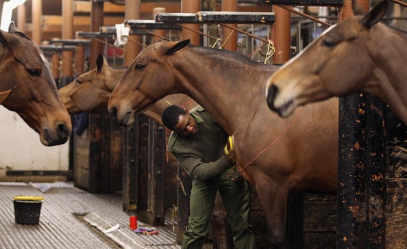 The Kings Troop have everything at Woolwich that they need for training and maintenance. It has massive outdoor training areas, an indoor riding school, a veterinary clinic, stabling for 140 horses, a saddlers’ workshop and a tailors’ workshop where all the tack is stitched by hand, and the largest, most modern blacksmith’s forge in the Army – it shoes over 70 horses a week!