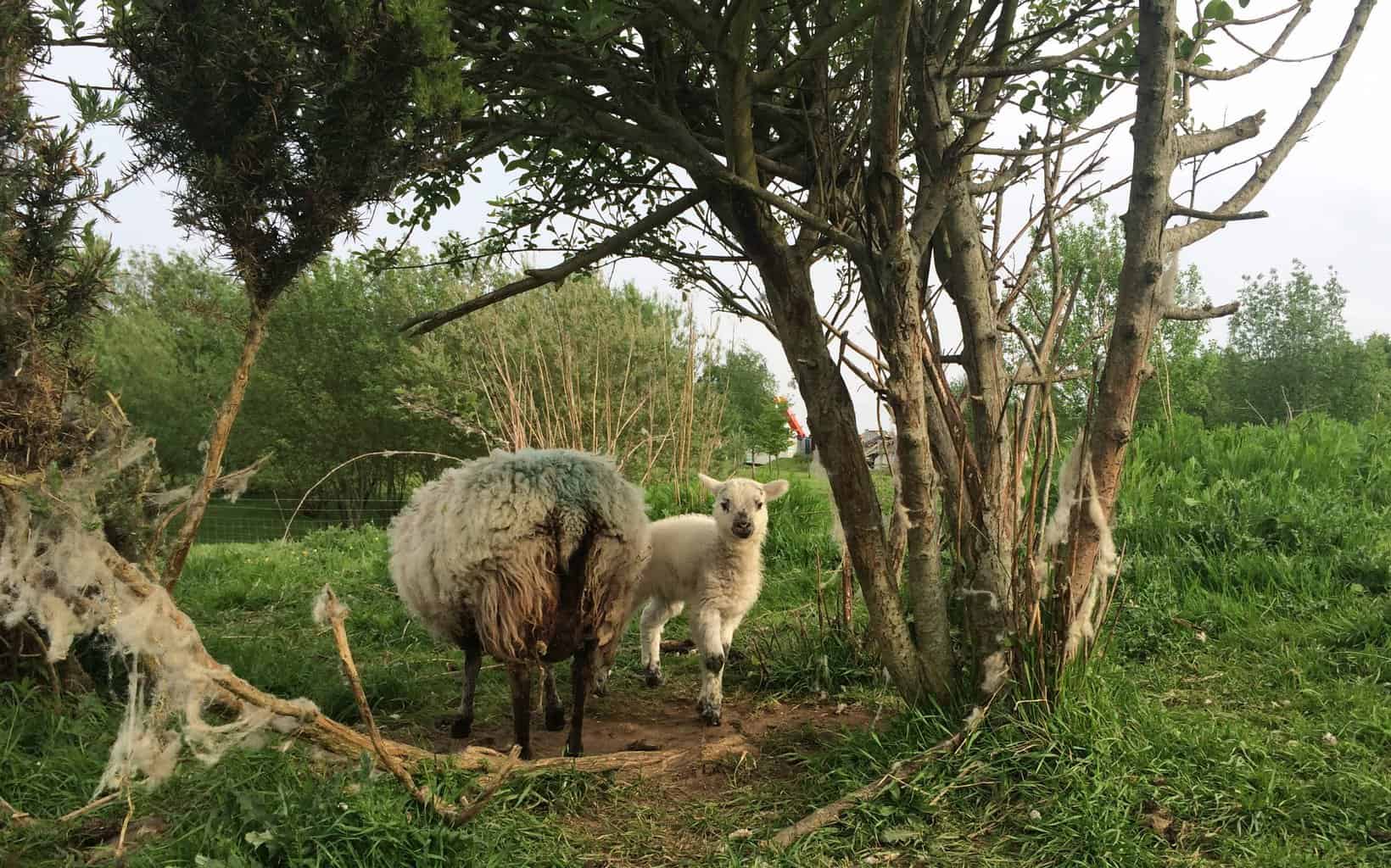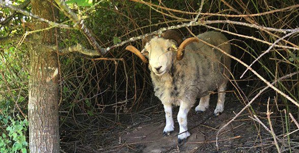 Here’s Bertrum, one of our rams. Have you seen a ram before? A ram is a male sheep. He’s built himself a den in the field! He’s done this by chewing and eating all the brambles back & sheltering underneath. Now he has his own homemade cave to sleep and rest in!