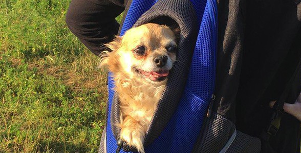 Here’s Banjo, our chihuahua. He suffers with arthritis so he can’t go on long walks like the other dogs. He walks with us over the fields, then when he gets too tired or it all gets too much, he travels in his backpack! How cool does he look?!