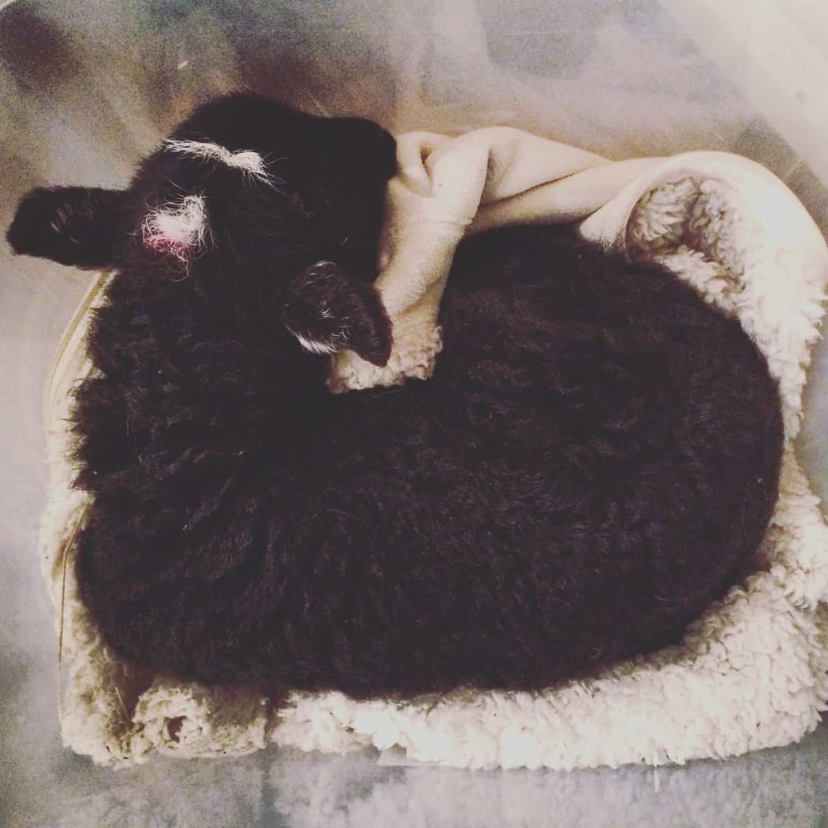He’s lovely and warm now, snuggled in a box with a thick blanket. Later on this evening, we’ll be moving him into a large dog crate filled with blankets, pillows and fleeces so that he has more space – and so my dogs don’t disturb him! He loves the dogs – but they aren’t so sure of him..